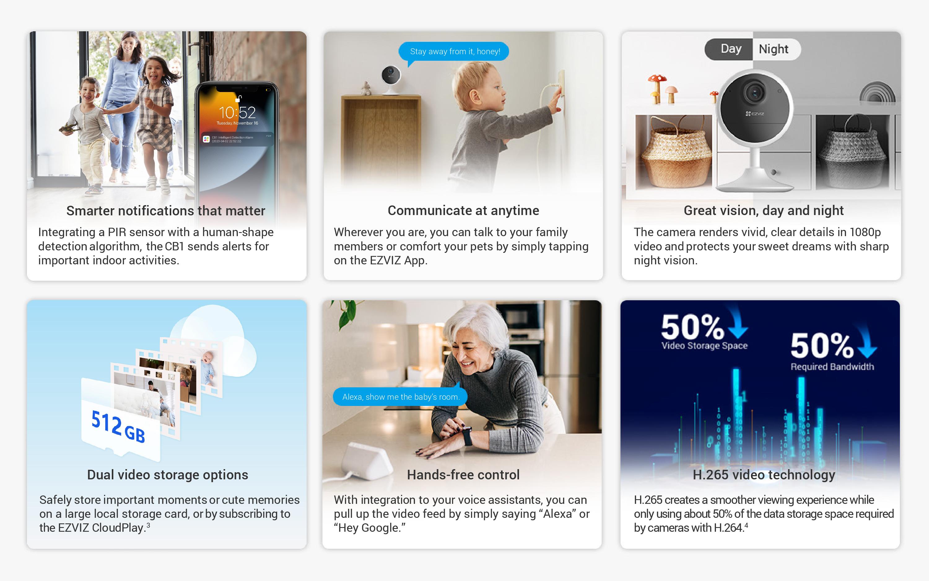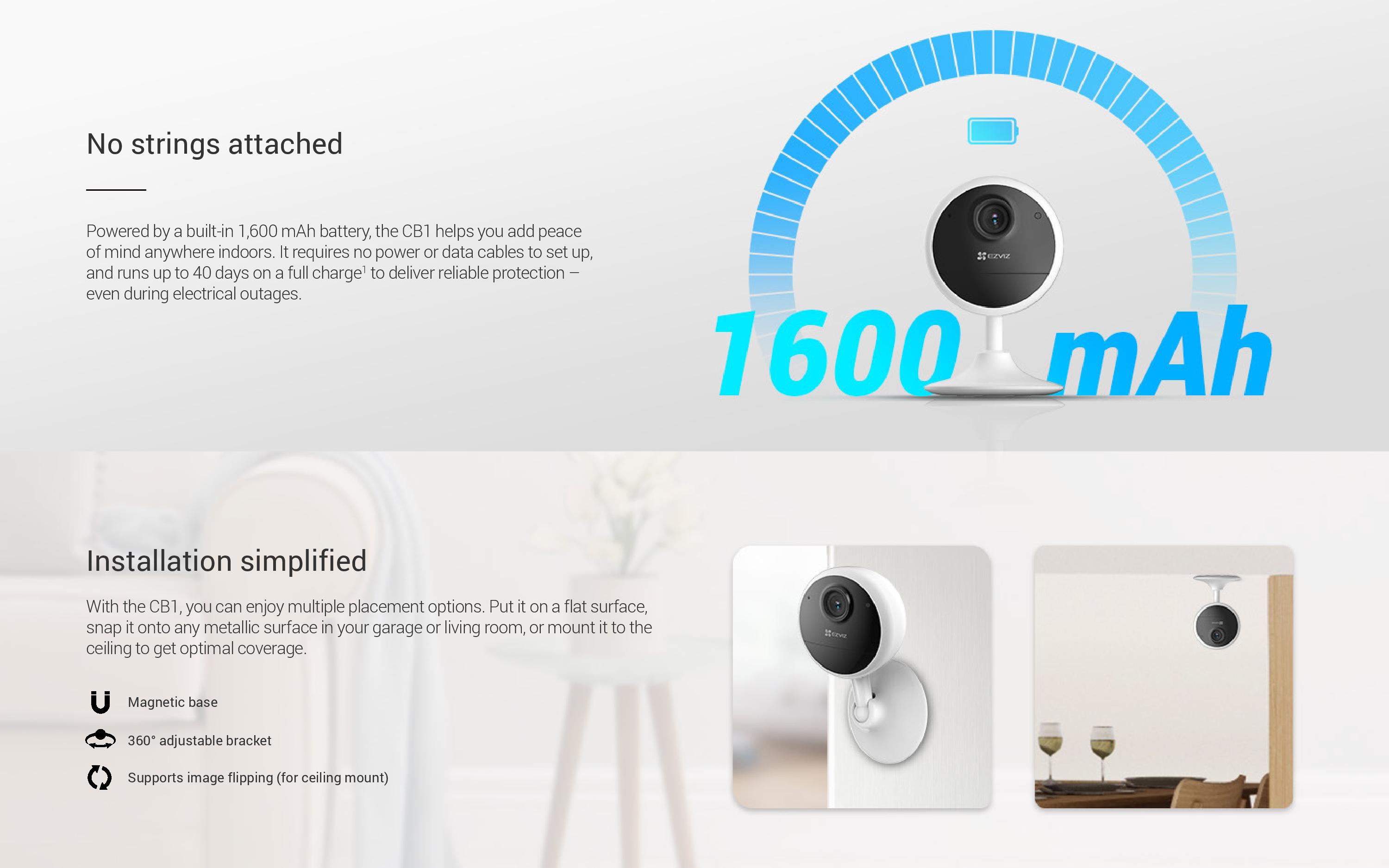 The Ezviz CB1 1080P Security Camera delivers clear HD video with a 113° wide-angle lens, making it perfect for home security. Equipped with motion detection, enhanced night vision, and two-way audio, it ensures round-the-clock protection. Featuring a magnetic base, easy installation, and 512GB storage, this camera offers reliable security with minimal setup. Stay connected with the 2.4GHz Wi-Fi and enjoy hassle-free operation with its long-lasting 1600mAh battery.
