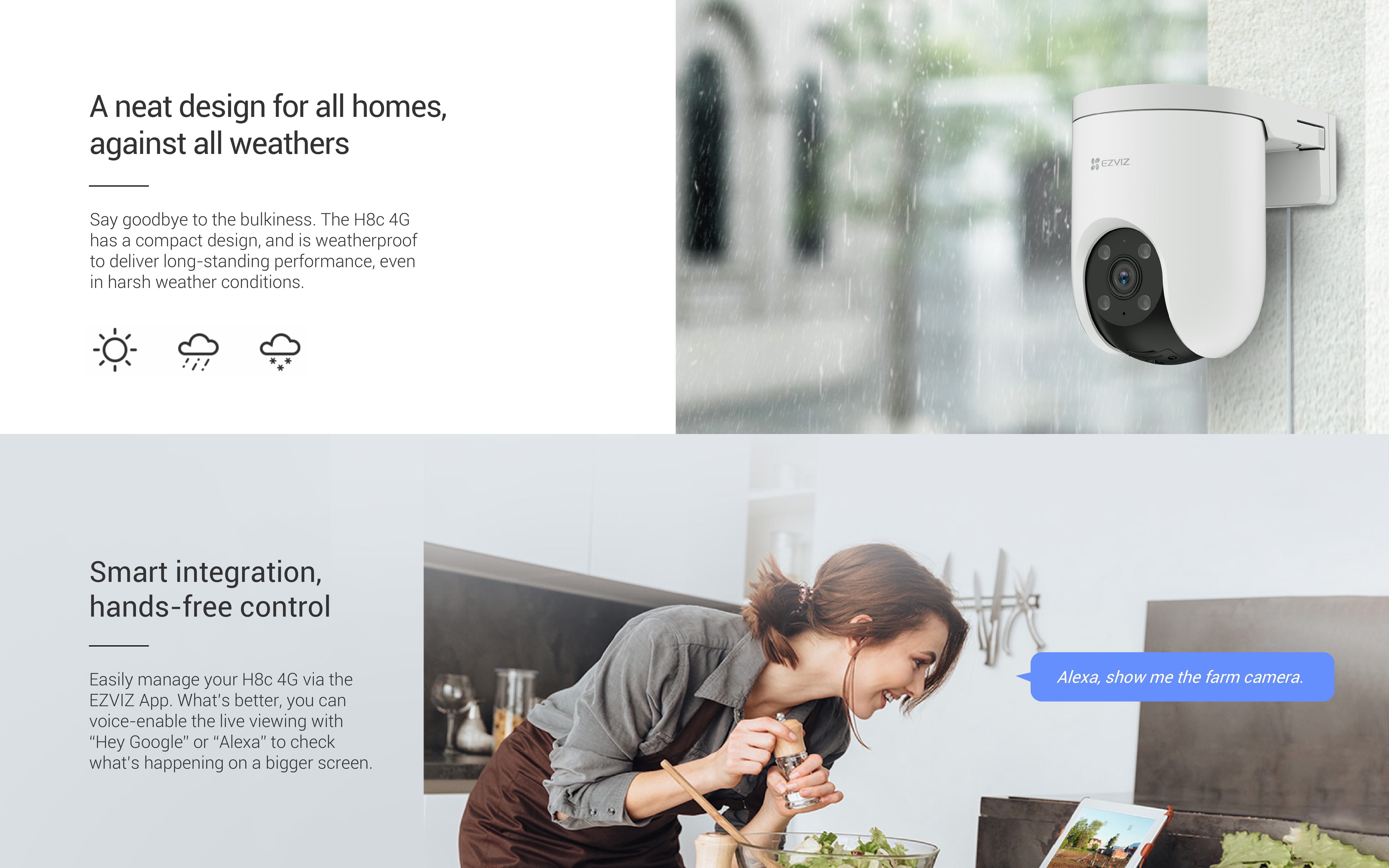 Stay ahead with the Ezviz H8C 4G security camera, featuring 2K resolution and panoramic view for high-definition surveillance. Equipped with AI-powered human and vehicle shape detection, it offers reliable security day and night with Color Night Vision. The camera supports 4G connectivity, auto-tracking, and integrates with Google Assistant and Alexa for seamless smart home control. Active defense features, including siren and strobe light, ensure that intruders are deterred. Its weatherproof design, two-way talk, and H.265 compression technology ensure excellent performance and efficiency, while 512GB storage provides ample space for footage.