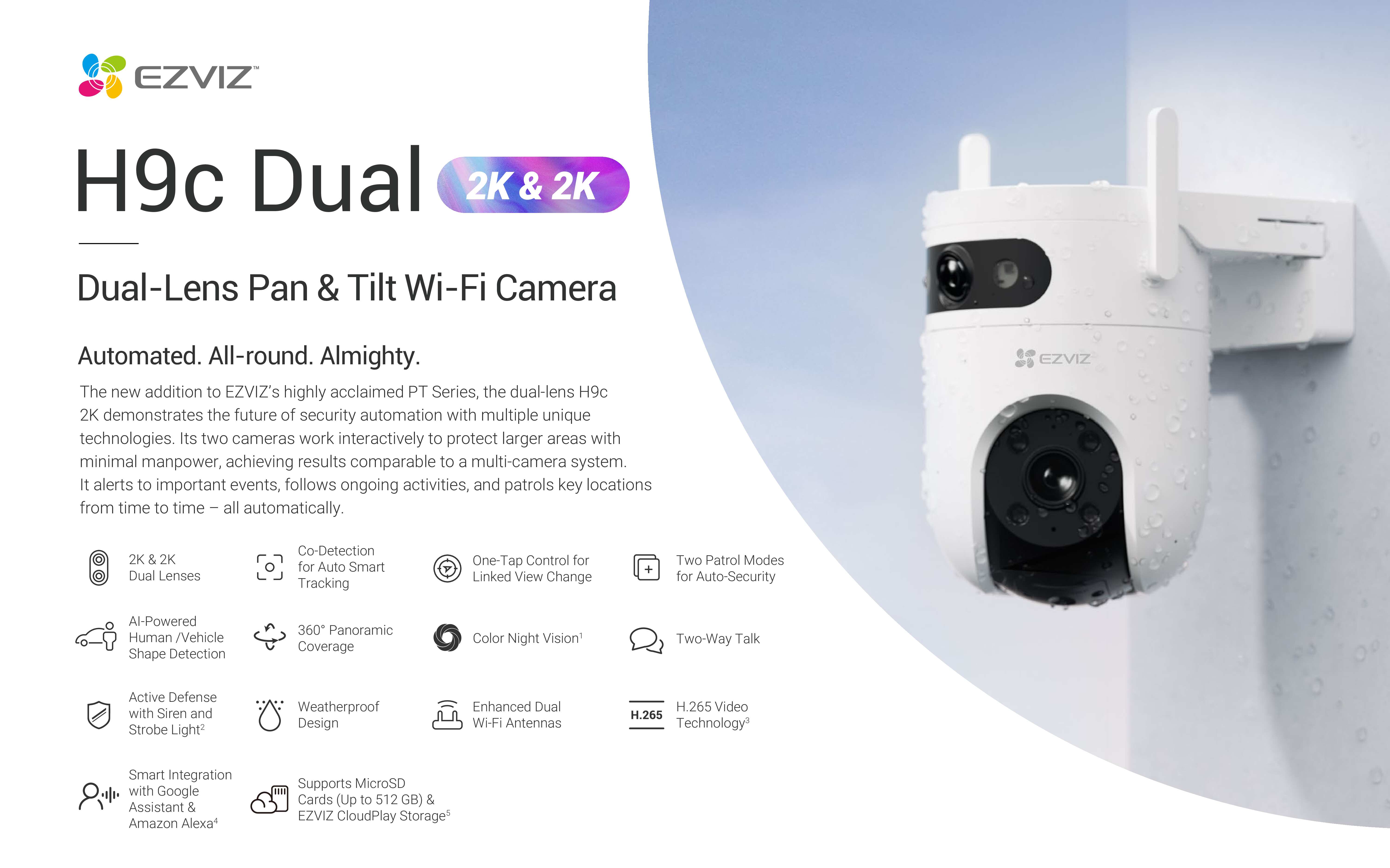 The Ezviz H9C delivers incredible 2K⁺ resolution with dual 3MP lenses for panoramic views. Featuring AI-powered human and vehicle shape detection, it ensures smarter security with Color Night Vision. Enjoy enhanced safety with two-way calling, CoDetection for auto smart tracking, and two patrol modes for auto security. One-tap linked view control makes monitoring simple, and 512GB storage ensures ample space for all your footage.