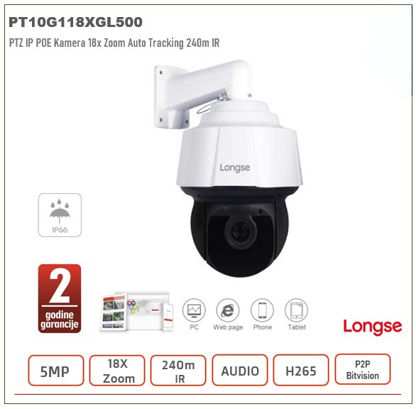 The Longse PT5A018XIGL500 5MP 18X Outdoor IR IP PTZ Camera delivers high-resolution surveillance with powerful 18X optical zoom, making it ideal for wide-area outdoor security monitoring. Built with a 1/2.8" Progressive Scan CMOS sensor, 120dB WDR, and 3D noise reduction, it ensures clear and detailed video in both day and night conditions. Supporting H.265/H.264 compression for efficient storage, this smart PTZ camera features advanced analytics such as 3D human tracking, motion detection, and intrusion detection for accurate threat alerts. Its durable metal housing and low power consumption make it a reliable choice for professional outdoor CCTV security systems.