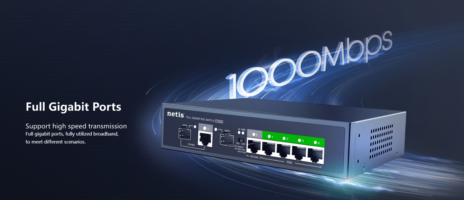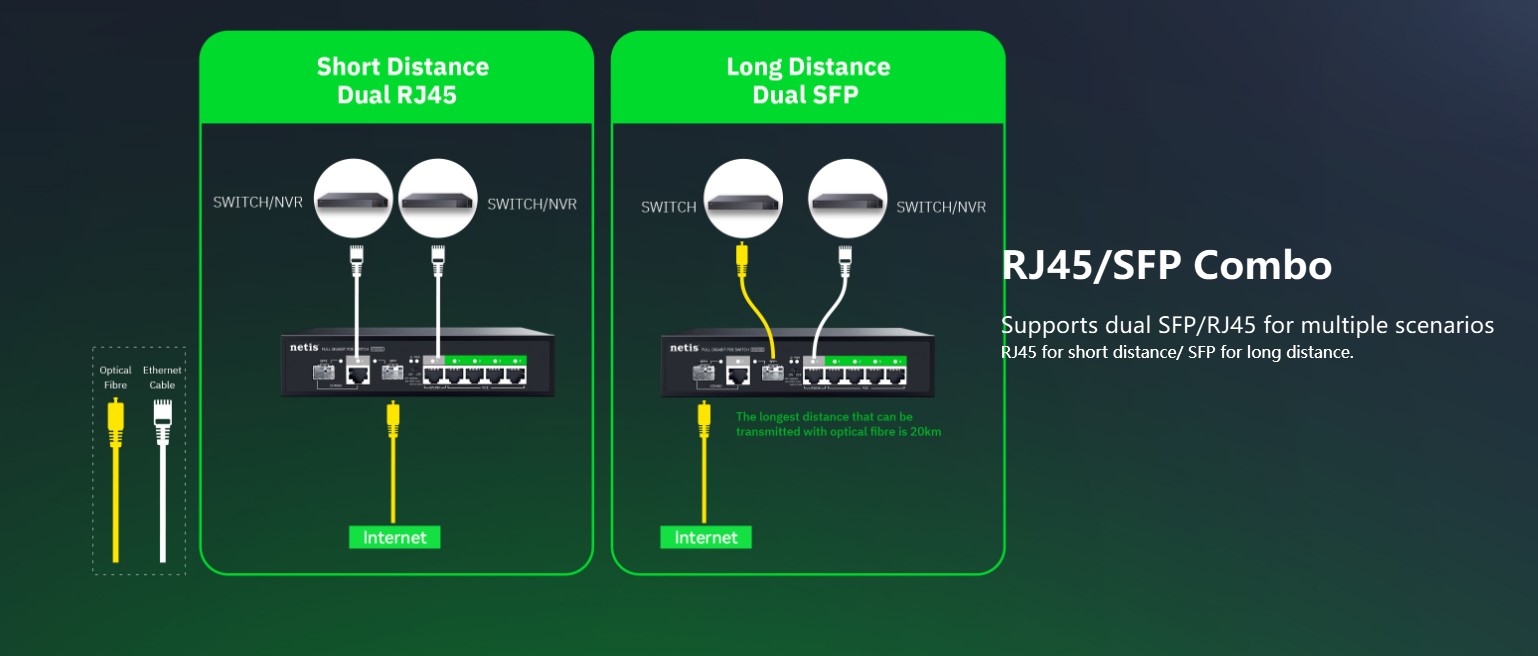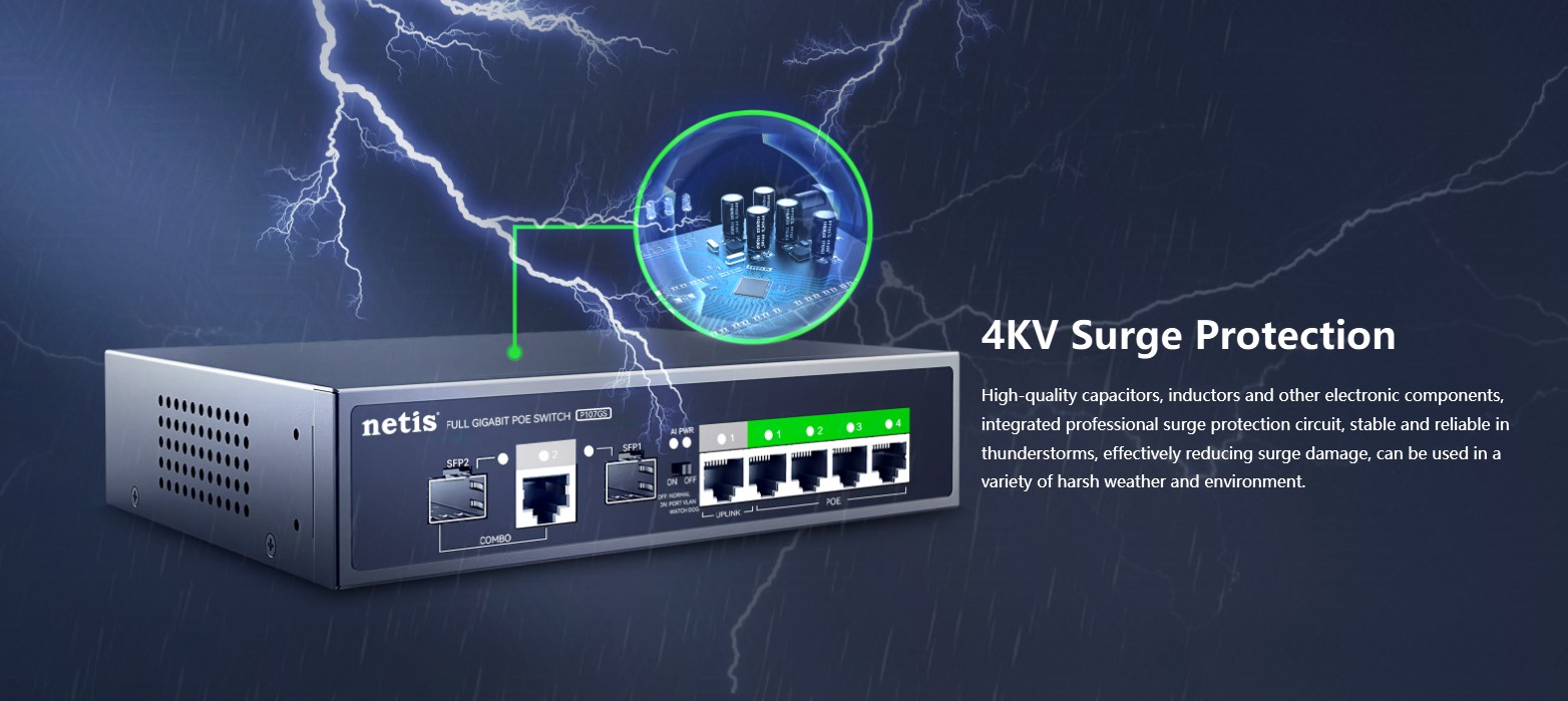 The Netis P107GS is a 4-port PoE Gigabit switch designed for small business and professional network setups. It features 4×10/100/1000M PoE ports, 1 uplink RJ45 port, and 2 uplink SFP slots for high-speed wired and fiber connectivity. With a 16G switching capacity and 2K MAC address table, it ensures stable data transmission across multiple devices. The durable metal housing and plug-and-play design make it perfect for IP cameras, access points, and network expansion in offices or commercial environments.