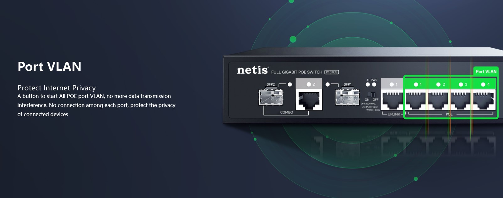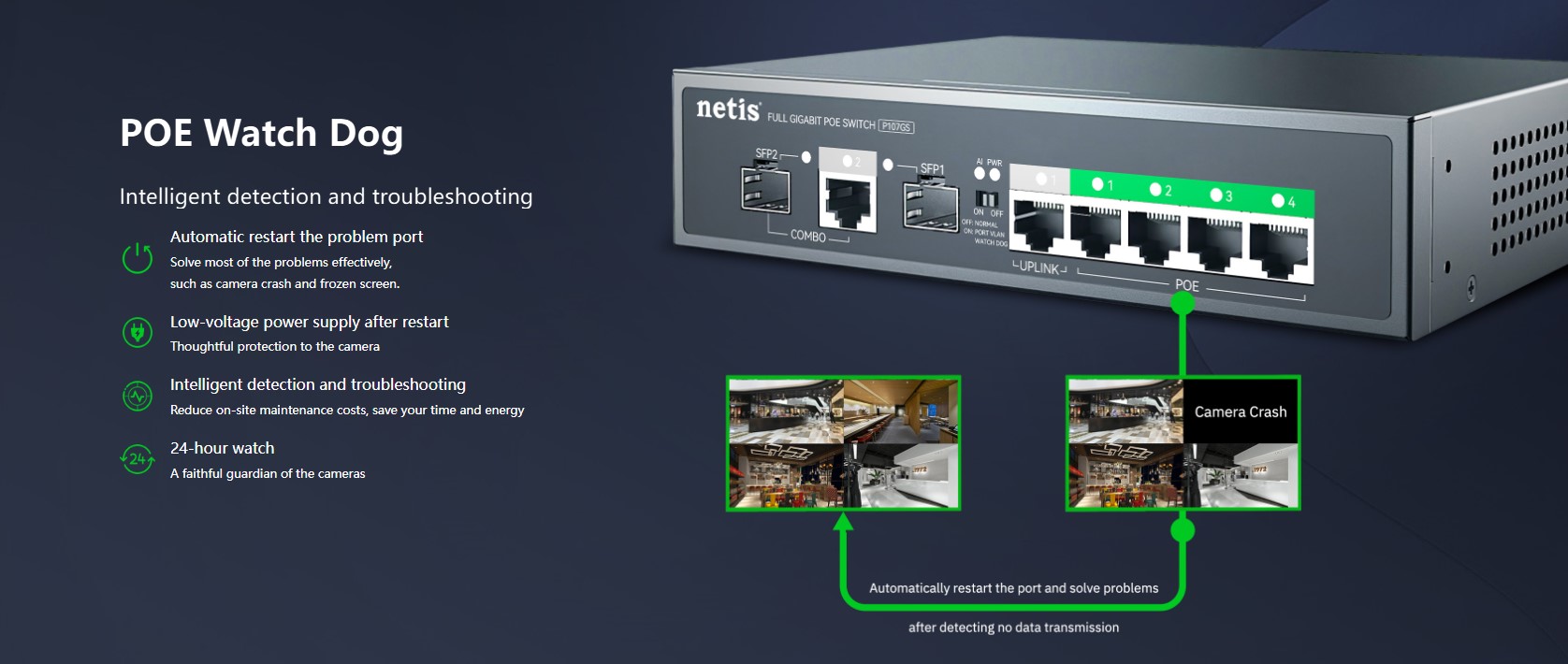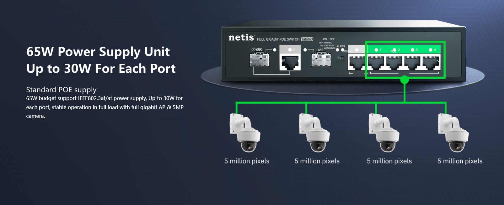 The Netis P107GS is a 4-port PoE Gigabit switch designed for small business and professional network setups. It features 4×10/100/1000M PoE ports, 1 uplink RJ45 port, and 2 uplink SFP slots for high-speed wired and fiber connectivity. With a 16G switching capacity and 2K MAC address table, it ensures stable data transmission across multiple devices. The durable metal housing and plug-and-play design make it perfect for IP cameras, access points, and network expansion in offices or commercial environments.