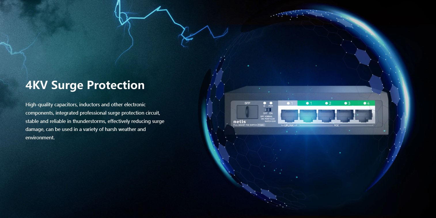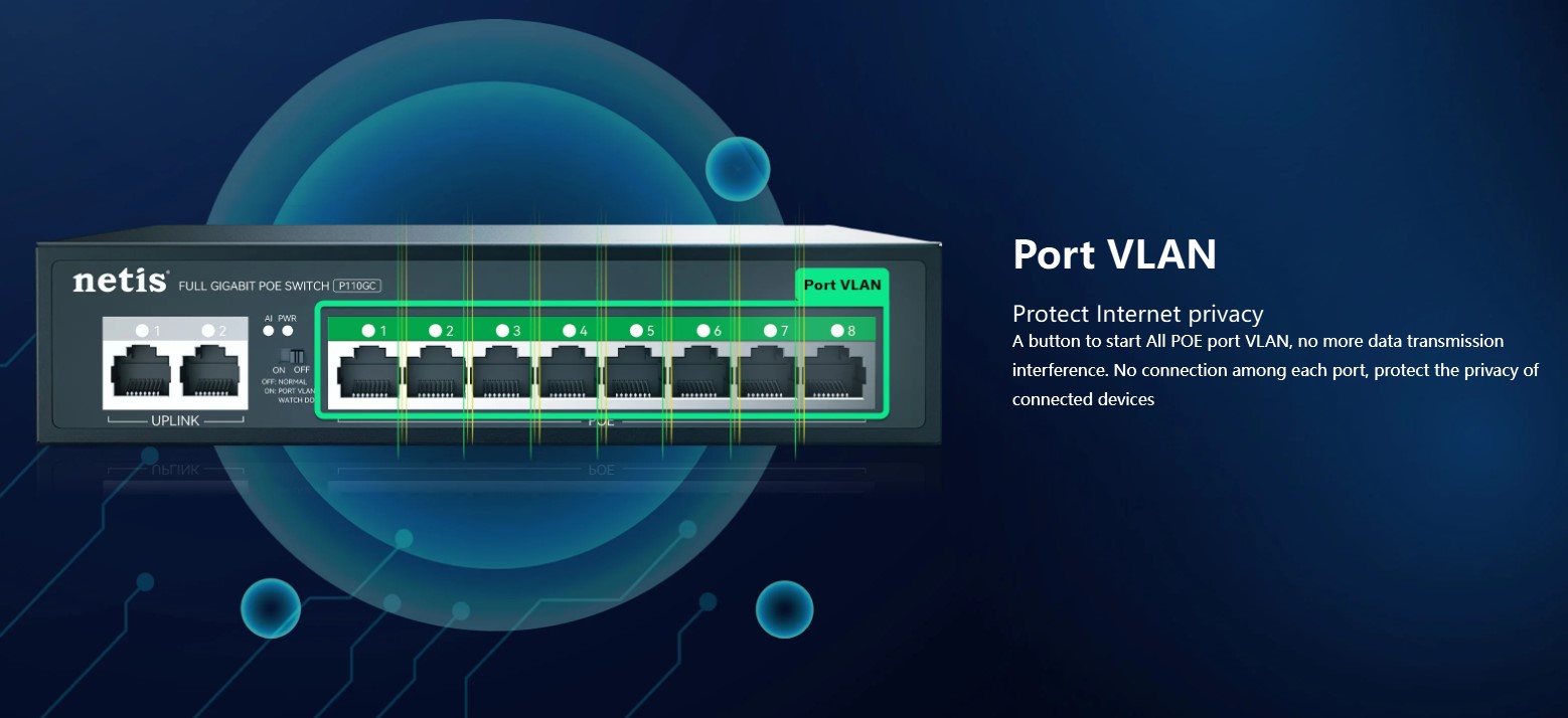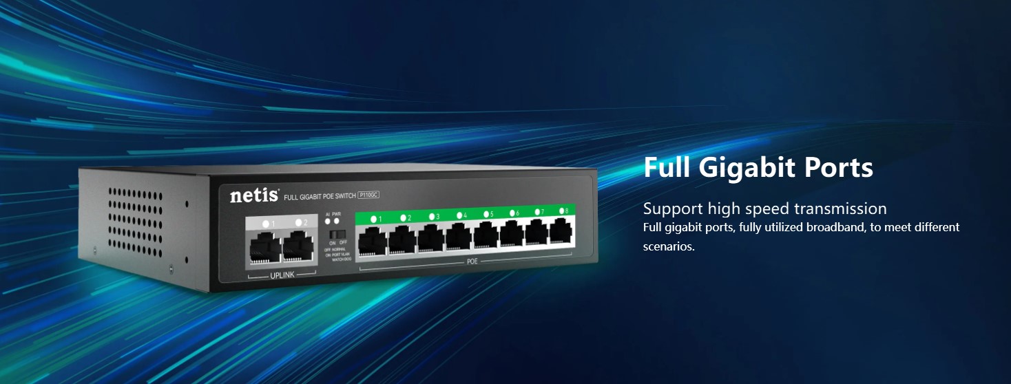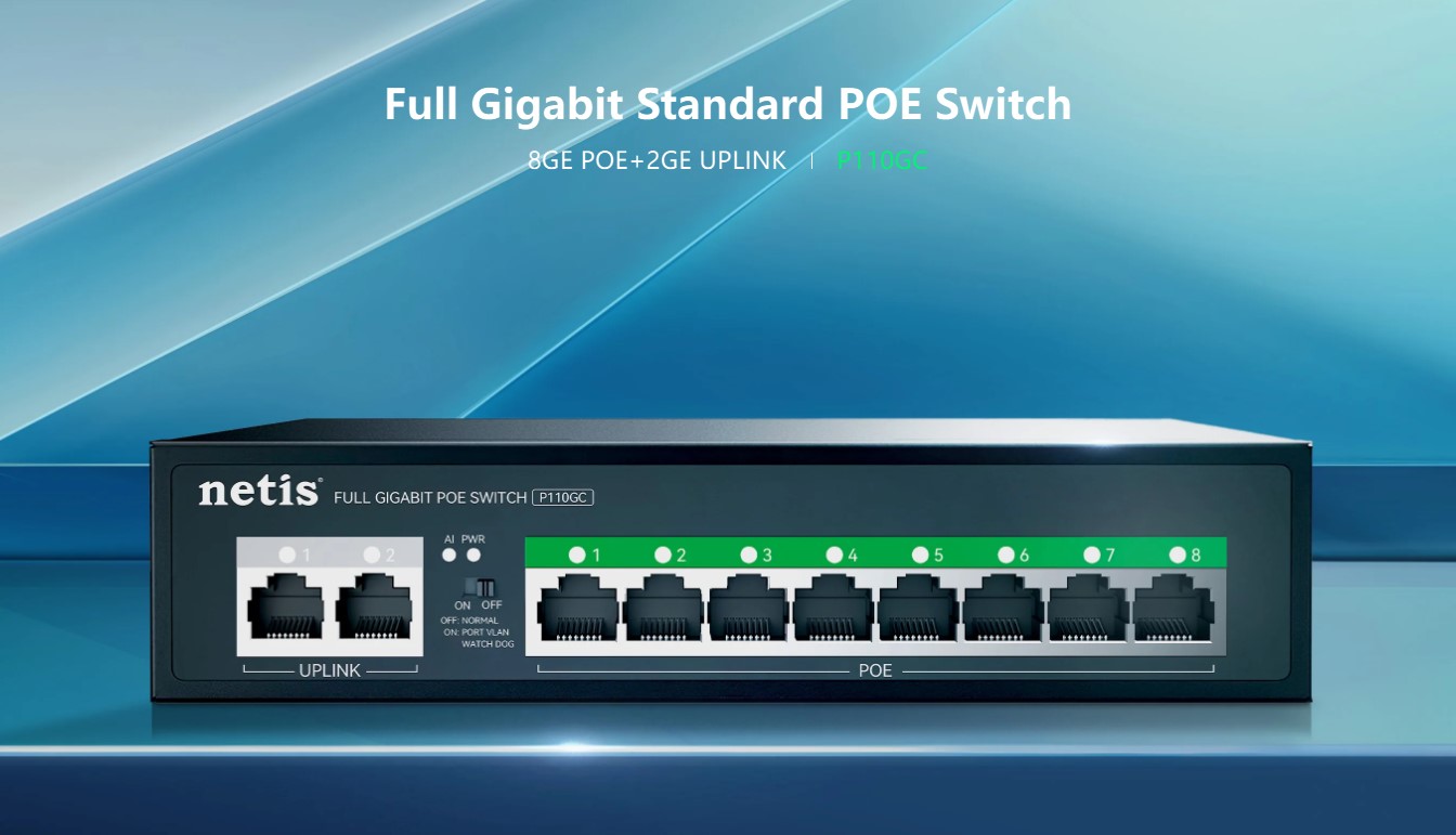 The Netis P110GC is an 8-port PoE Gigabit switch designed for small to medium business networks. It features 8×10/100/1000M PoE ports, 2 uplink RJ45 ports, a 20G switching capacity, and a 2K MAC address table, ensuring fast, stable, and reliable network performance. Its plug-and-play setup and durable metal casing make it ideal for IP cameras, access points, and network expansion in offices, commercial spaces, and smart home setups.