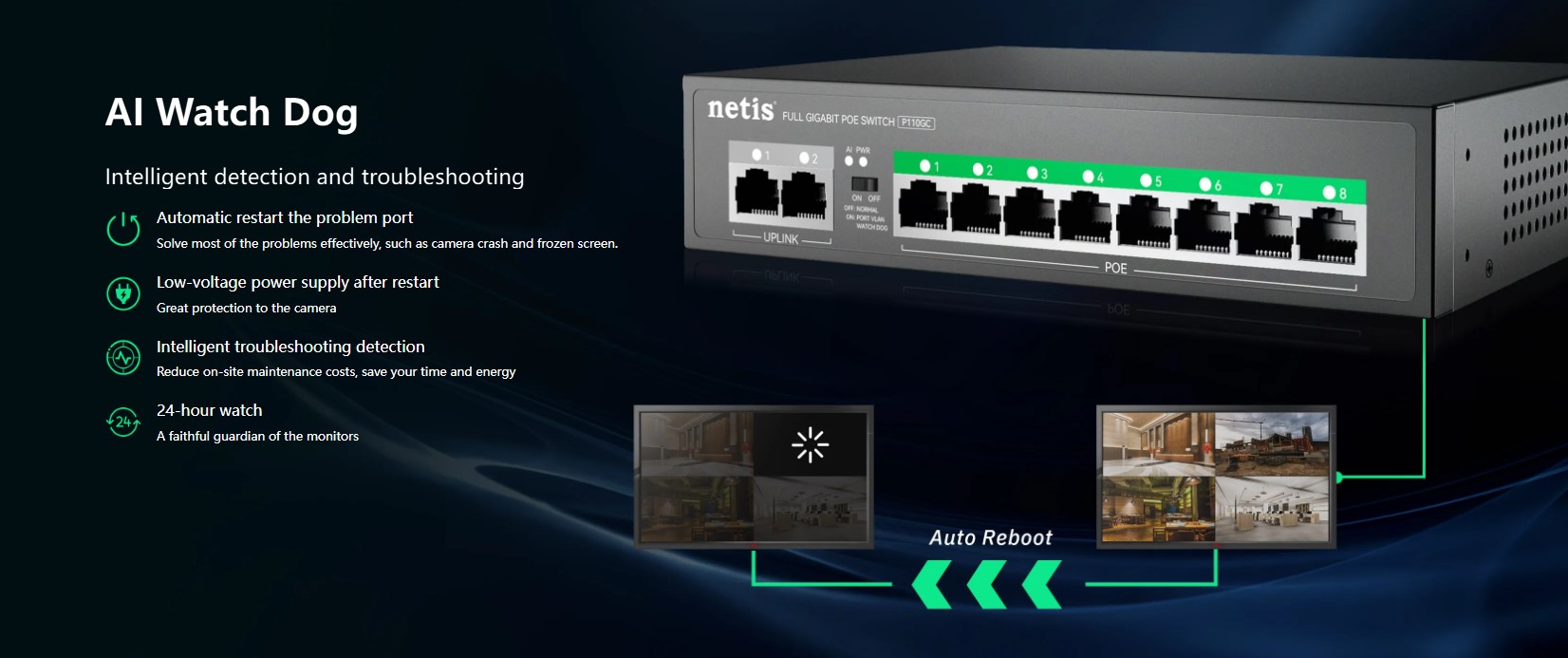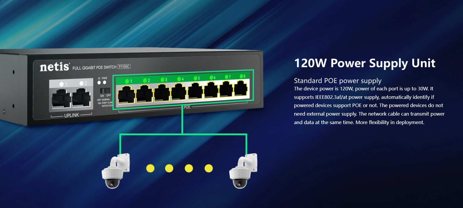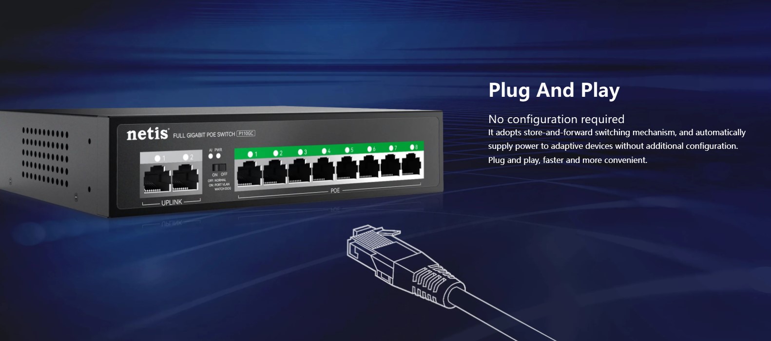 The Netis P110GC is an 8-port PoE Gigabit switch designed for small to medium business networks. It features 8×10/100/1000M PoE ports, 2 uplink RJ45 ports, a 20G switching capacity, and a 2K MAC address table, ensuring fast, stable, and reliable network performance. Its plug-and-play setup and durable metal casing make it ideal for IP cameras, access points, and network expansion in offices, commercial spaces, and smart home setups.