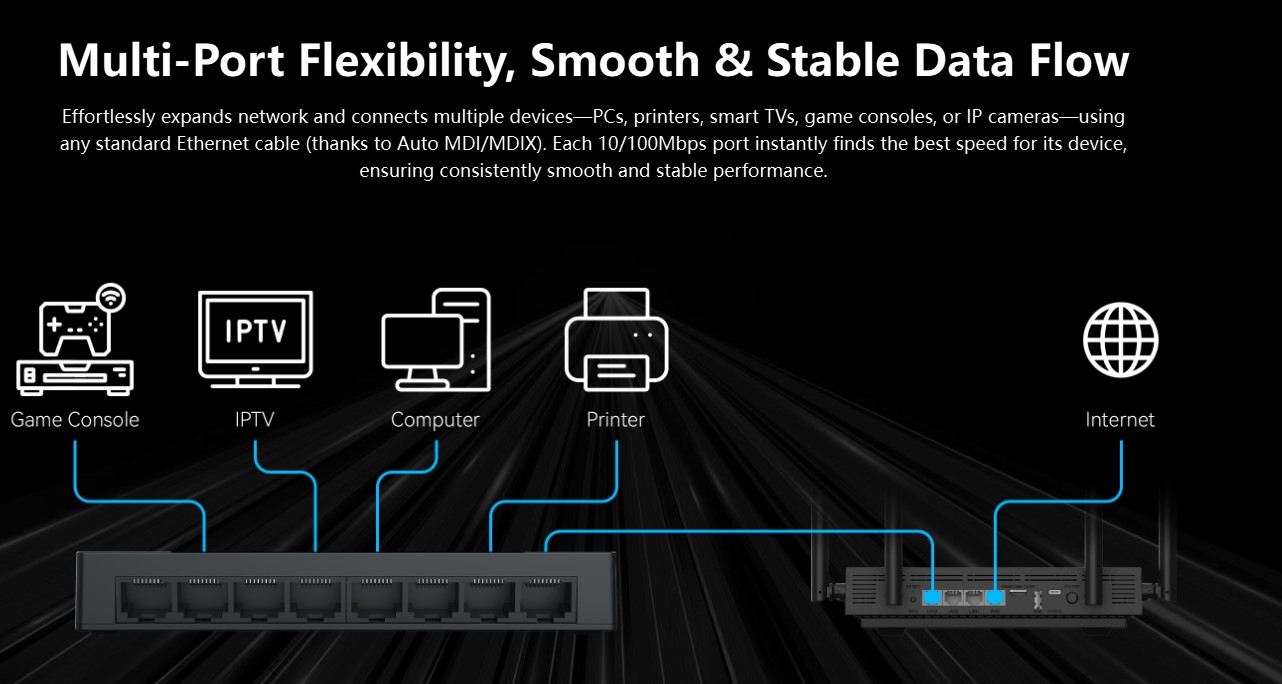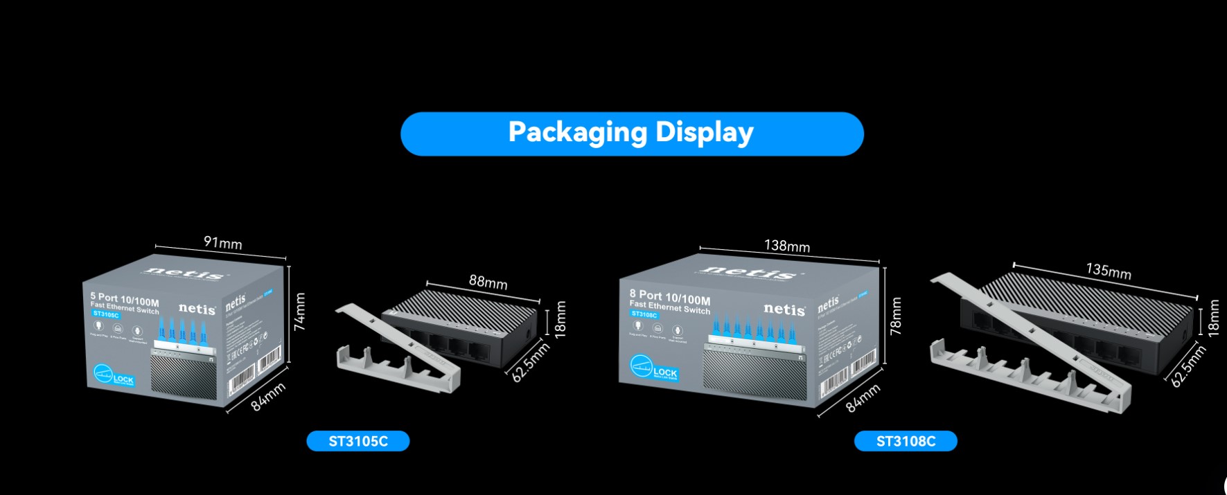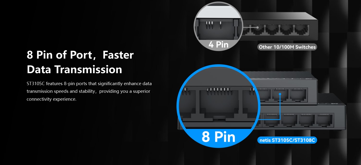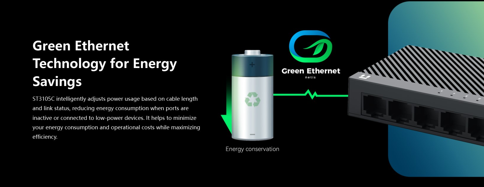 The Netis ST3105C is a compact 5-port 10/100Mbps RJ45 switch designed for reliable home and office networking. Featuring store-and-forward transmission, it ensures stable data delivery and minimizes packet loss. With a 2K MAC address table, this switch efficiently manages network traffic for smooth connectivity. Ideal for small networks, desktop setups, and plug-and-play installation, the ST3105C delivers fast, stable, and energy-efficient network performance.