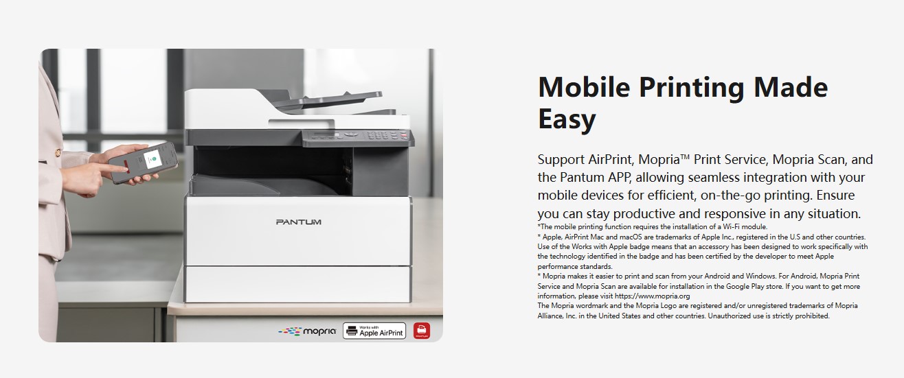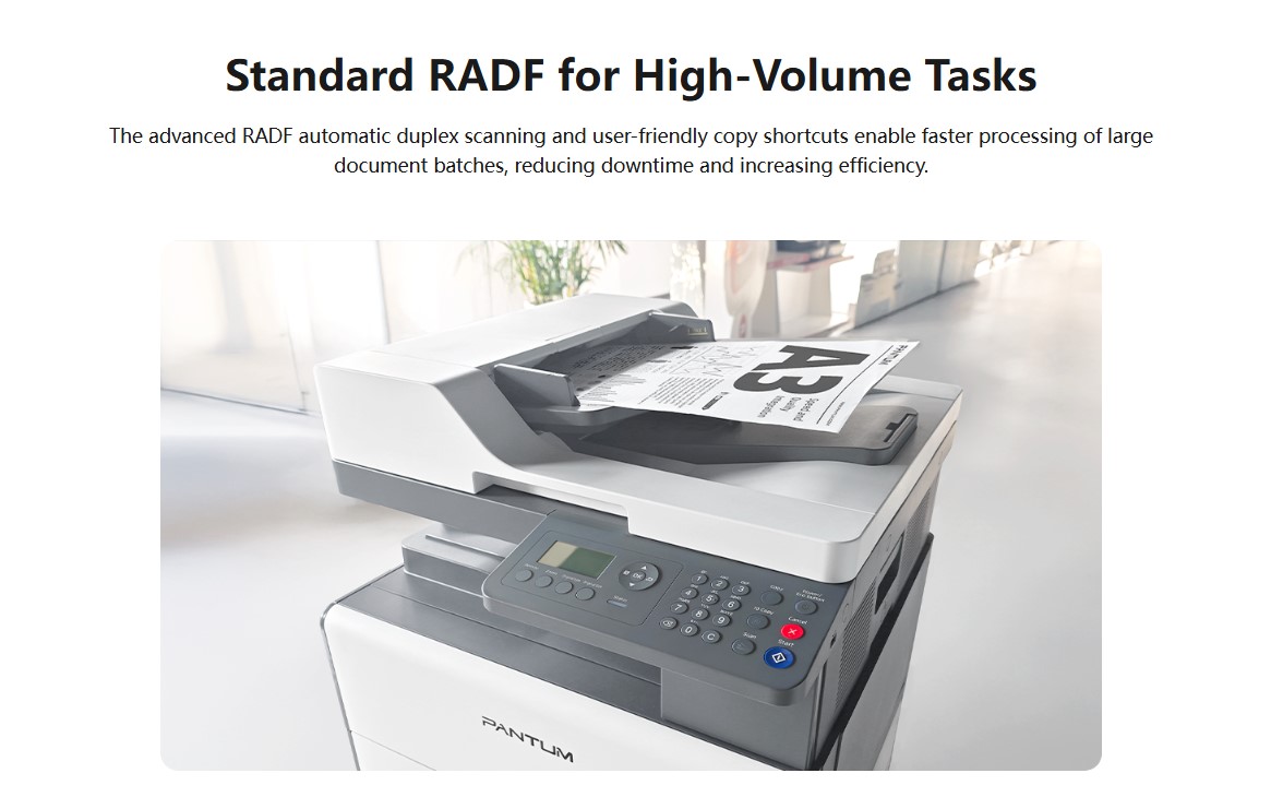 The Pantum BM230ADN All-in-One Laser Printer is a versatile solution for high-volume office and business environments. Capable of printing, scanning, and copying, it delivers 22ppm print speeds for A3-sized documents. The USB and network connectivity options make it easy to integrate into any office setup. With a monthly duty cycle of 60,000 pages, this robust printer ensures long-lasting performance. Featuring a Flatbed + RADF scanner, it provides efficient scanning for both single and multi-page documents.